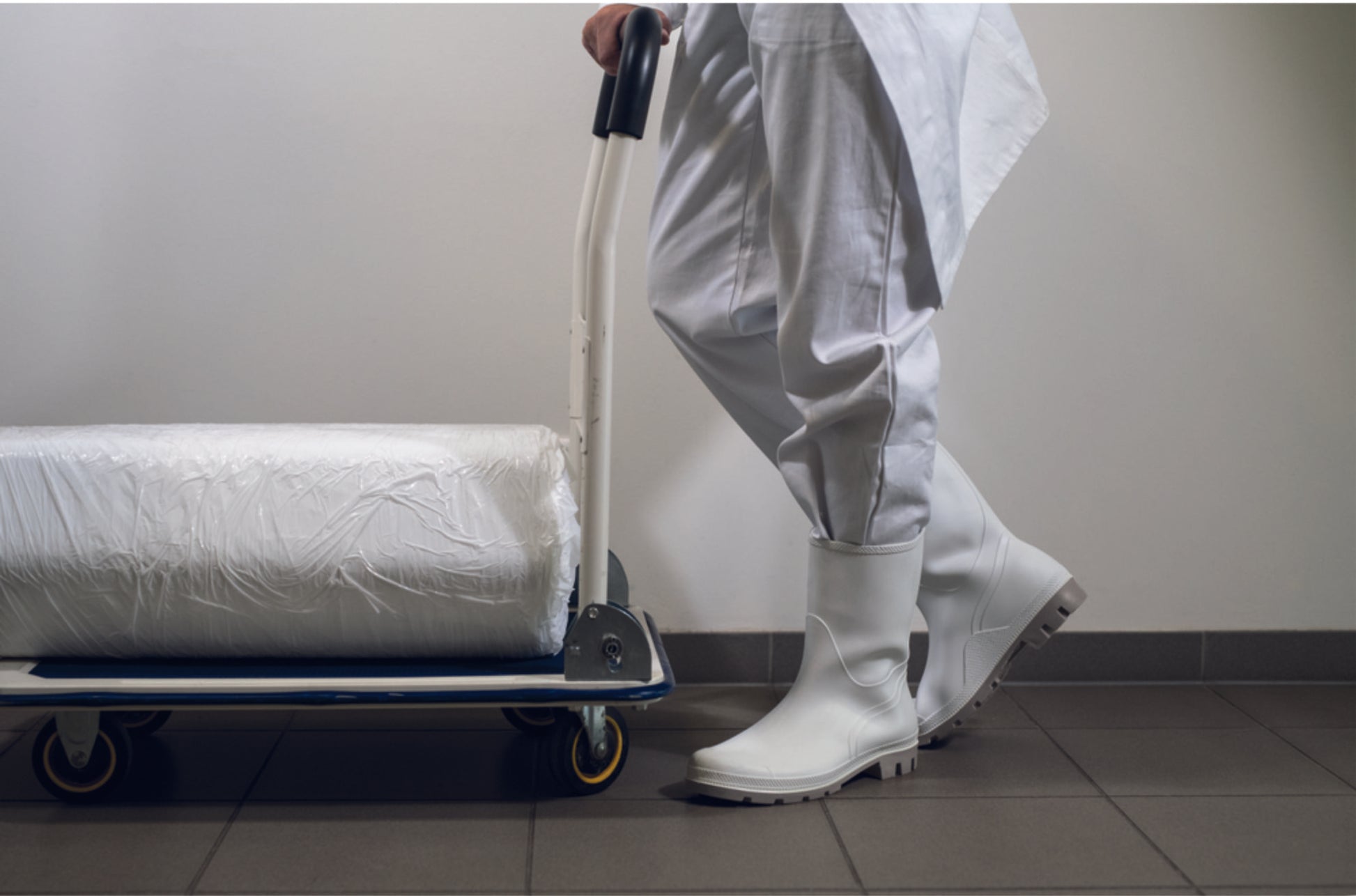 Bottes basses en PVC blanc et nitrile résistantes aux chocs, à base de graisses végétales et animales, avec semelle à profil profond. Hauteur 28 cm.