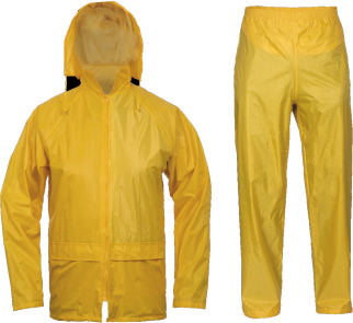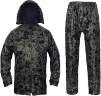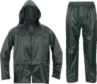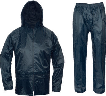 Combinaison imperméable deux pièces avec capuche: manteau ¾ avec capuche intégrée dans le col et pantalon à la taille élastique, deux larges poches avant recouvertes de rabats contre la pénétration de l'eau. La partie inférieure des manches peut être ajustée par pression. Ventilation dans le dos et sous les aisselles.
