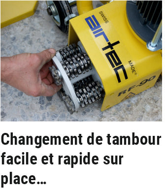sont placés librement sur un tambour de travail pivotant, ce qui permet de gratter et de fraiser en profondeur mais en toute douceur la colle, le caoutchouc, la boue de béton, les irrégularités et les vieilles couches de peinture. Le design rend la machine à ras bord parfaitement équilibrée
