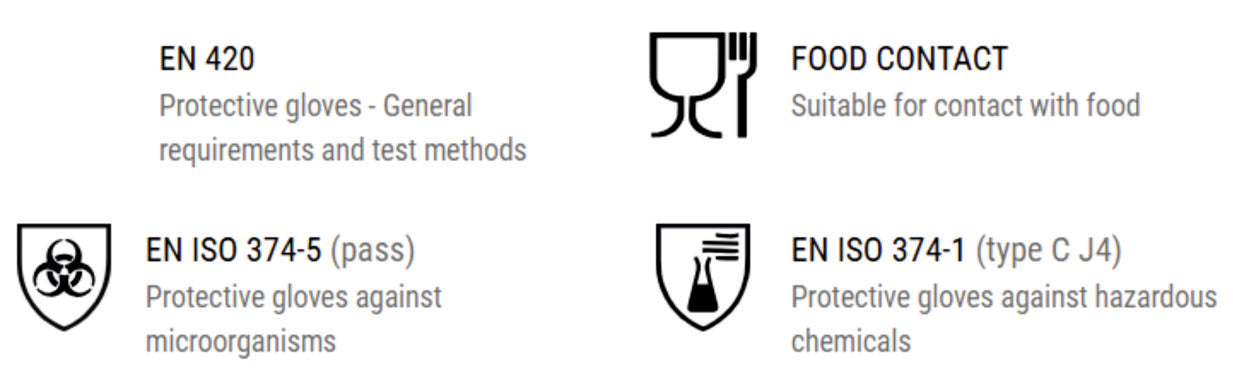 Normes :EN 420 EN ISO 374-1 (type C J4), EN ISO 374-5 (conforme)