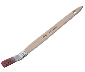 Soies synthétiques fines, virole en tôle d'acier inoxydable courbée. Manche ergonomique en bois brut